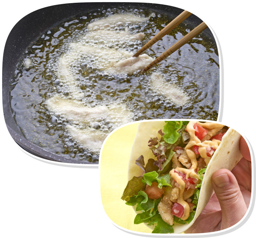クリーミーチキンタコス。調理時間は約10分。クリーミーなディップソースがタコスと相性抜群! クリーミーチキンタコス。調理時間は約10分。クリーミーなディップソースがタコスと相性抜群!