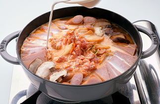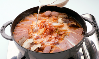 牛乳でコク深い味に! 人気の韓国レシピ「ミルクプデチゲ」のレシピをご紹介します。