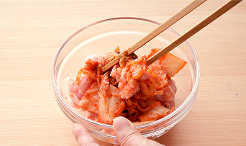 豚肉もひとくち大に切って、キムチと和えます。