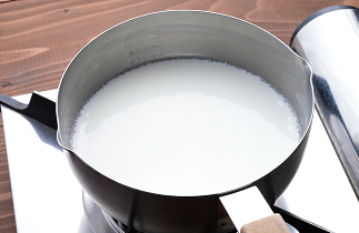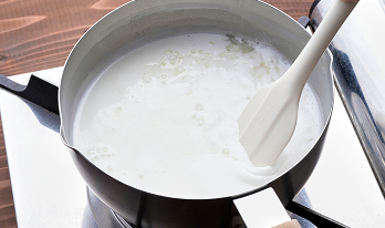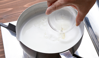 - 1 鍋に牛乳を入れて火にかけ、かき混ぜながら60℃ぐらいになるまで温めます。