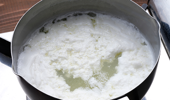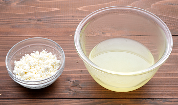 しばらくすると牛乳のタンパク質と水分が分離し、おぼろ豆腐状のかたまり(チーズ)とやや黄色がかった水分(ホエイ)に分離していきます。