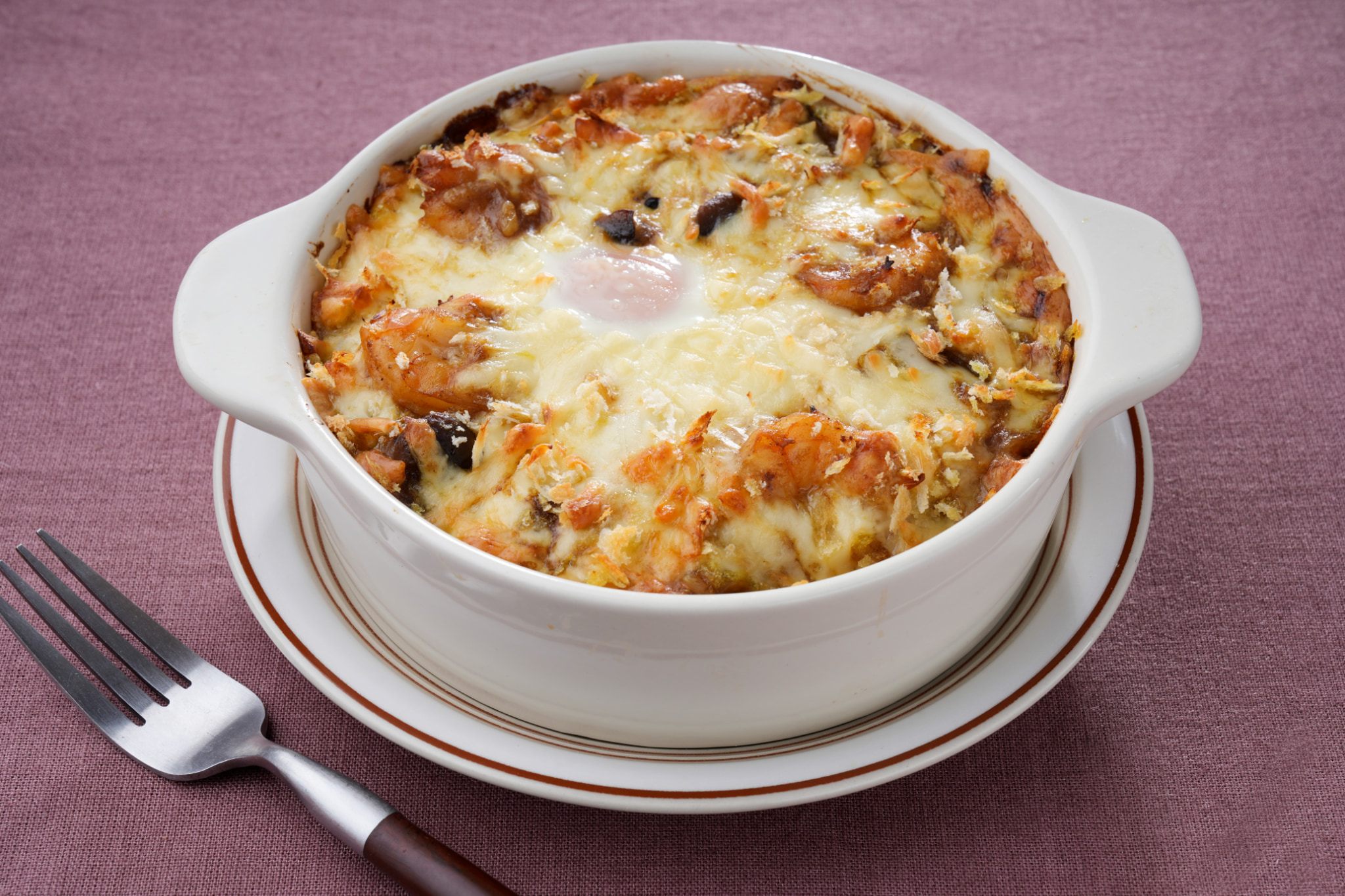 - 4 グラタン皿にご飯を盛り、③をかけ、中心にくぼみを作り卵を入れる。溶けるチーズをかけパン粉を散らして、オーブントースターできつね色になるまで焼く。
