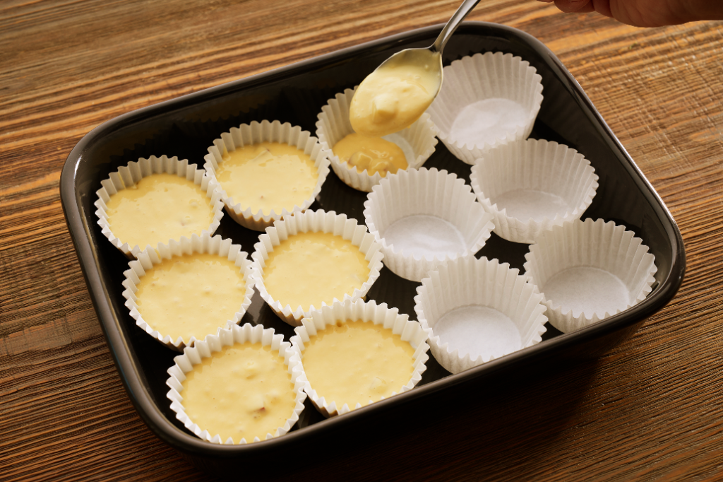 - 4 耐熱容器に紙カップを並べ、③をカップの7分目まで注ぎます。さらにその上に飾り用のさつまいもを散らし、ふんわりとラップをかけたら600Wの電子レンジで6分加熱します。