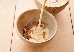 - 3 小鍋で豆乳を温めます。沸騰直前まで温まったら、器に均等に注ぎ入れます。