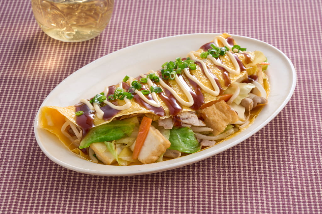 - 4 ③のフライパンに油を入れて熱し、②を全体に流して焼き、③をのせて半分に折りたたむ。