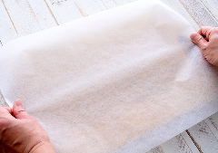 クッキングシートを25~30cm角に切ります。具材が大きい場合は、少し大きめにすると包みやすくなります。