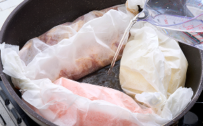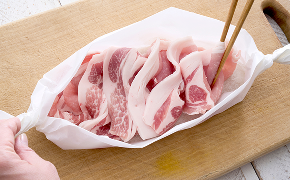クッキングシートで作った舟形に豚肉をのせ、<A>をかけて全体をよく混ぜたら、両端をねじって包みます。