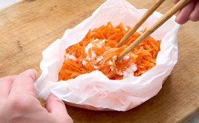 千切りにしたにんじんをクッキングシートで作った舟形にのせ、両端をねじって包みます。