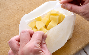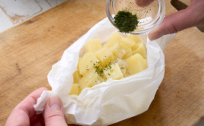 ひとくち大にカットしたじゃがいもをクッキングシートで作った舟形にのせ、両端をねじって包みます。