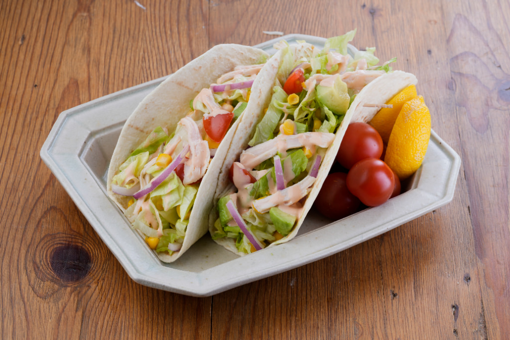 - 2 トルティーヤにレタス、チキン、トマト、紫玉ねぎ、アボカド、コーンをのせ、混ぜ合わせたソースをかける。