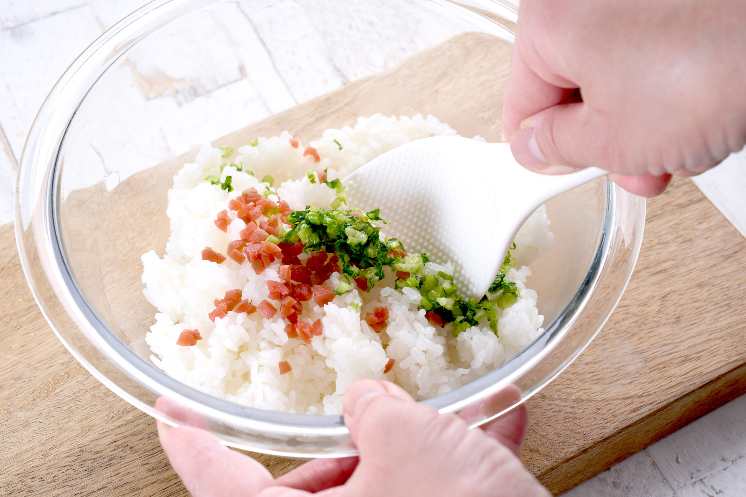 - 2 ボウルにごはん、①、梅を混ぜ合わせます。
