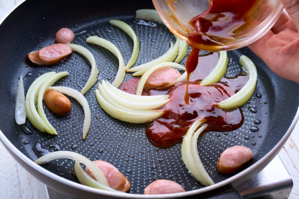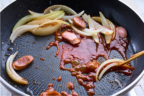 フライパンに炒め油を熱し、たまねぎ、ソーセージを炒めます。たまねぎが半透明になってきたら、<A>を加えてさらに炒めます。