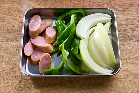 たまねぎ、ソーセージを薄切りにし、ピーマンは細切りにします。